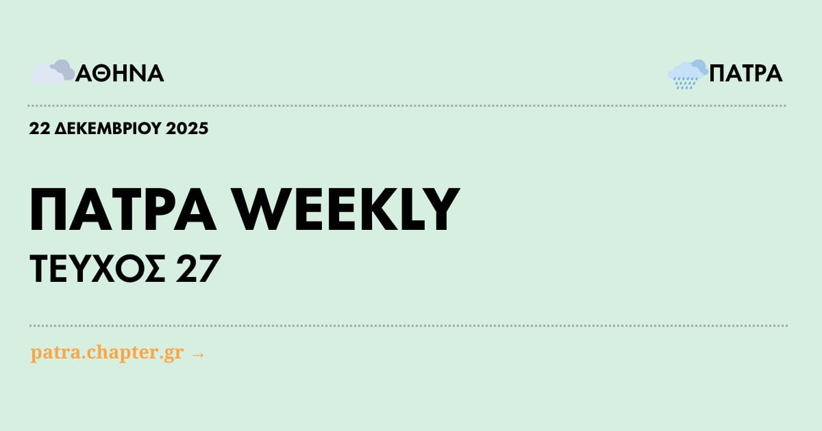 Ένα γεμάτο ενέργεια 24ωρο στην πρωτεύουσα της Αχαΐας κλέβει την παράσταση με πλατεία Γεωργίου, Κάστρο και Μαρίνα να πρωταγωνιστούν, η ποτοποιία Τεντούρα Κάστρο - Χάχαλης επιστρέφει παραμονή Χριστουγέννων με την 16η γιορτή της και τους Slinky Brothers, ενώ τα ‘17 βήματα προς βιώσιμη πόλη’ θέτουν πράσινη ατζέντα για θύλακες δροσιάς και ποδηλατικές συνδέσεις.